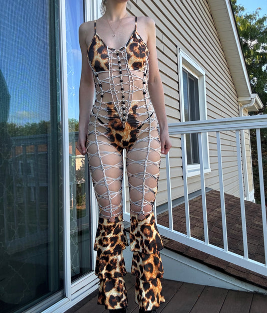 LEOPARD SLITWEAVE BRAIDED FLARE JUMPSUIT