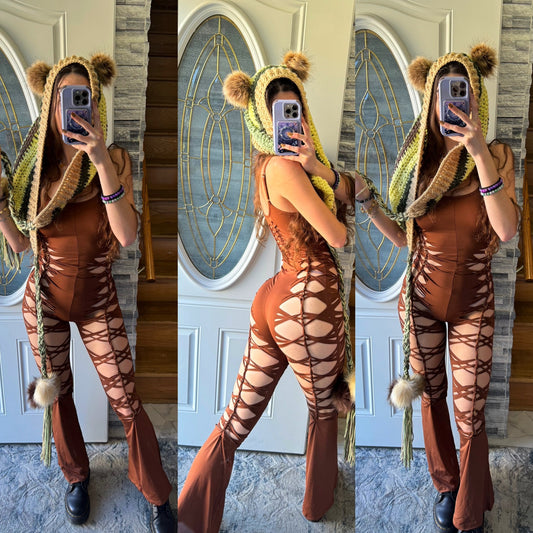 THE SǏREN JUMPSUIT - BROWN FLARE SLITWEAVE JUMPSUIT