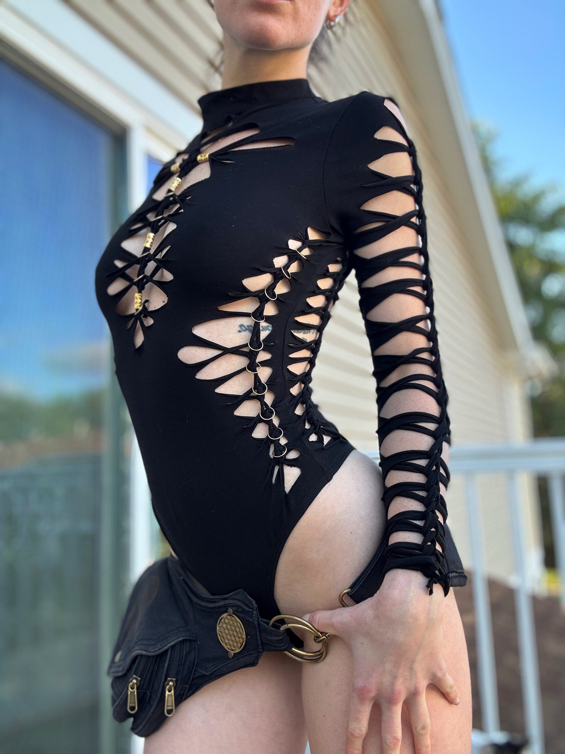 - Black slitweave / braided mock neck long sleeve bodysuit