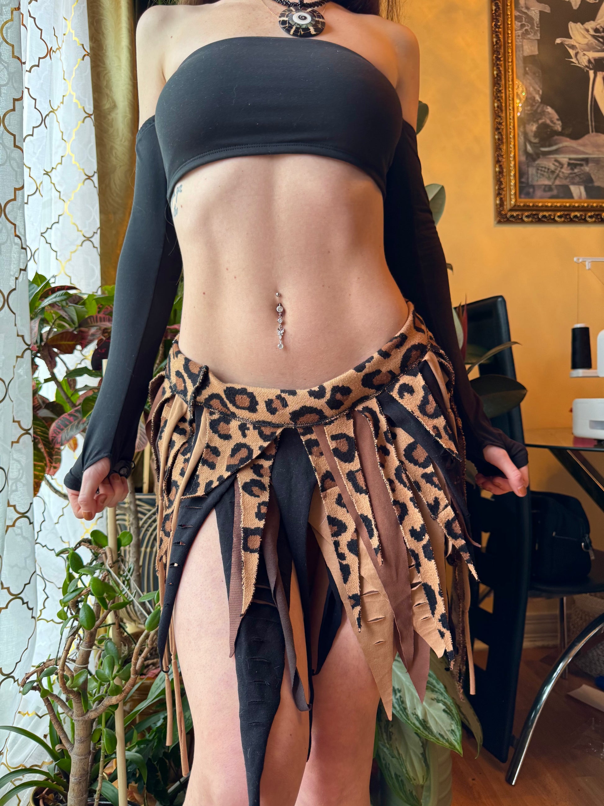 - Blend of cheetah sweater fabric, black, browns, silver O-rings