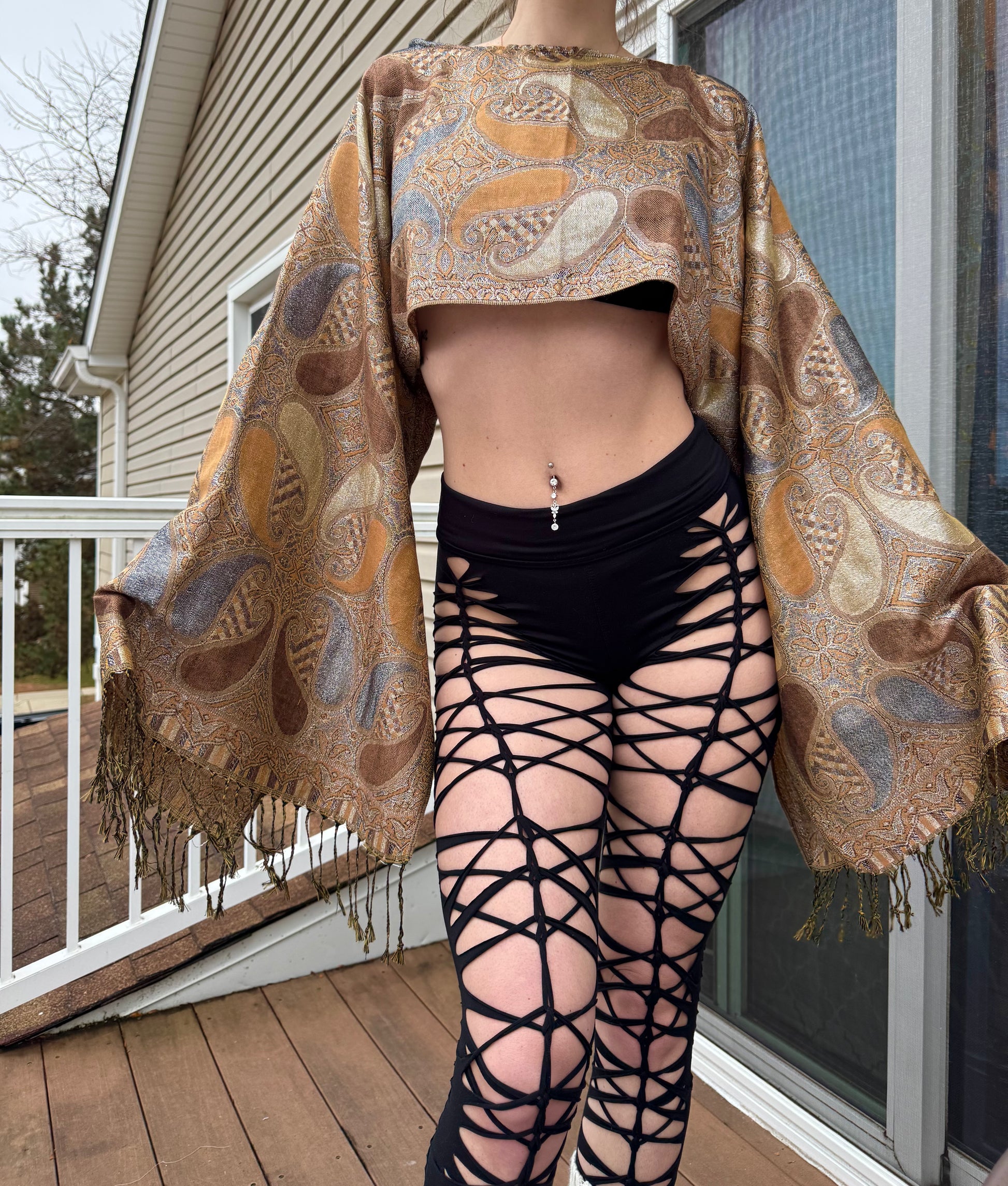 - Light brown sparkly hand sewn pashmina crewneck / long sleeve top shawl