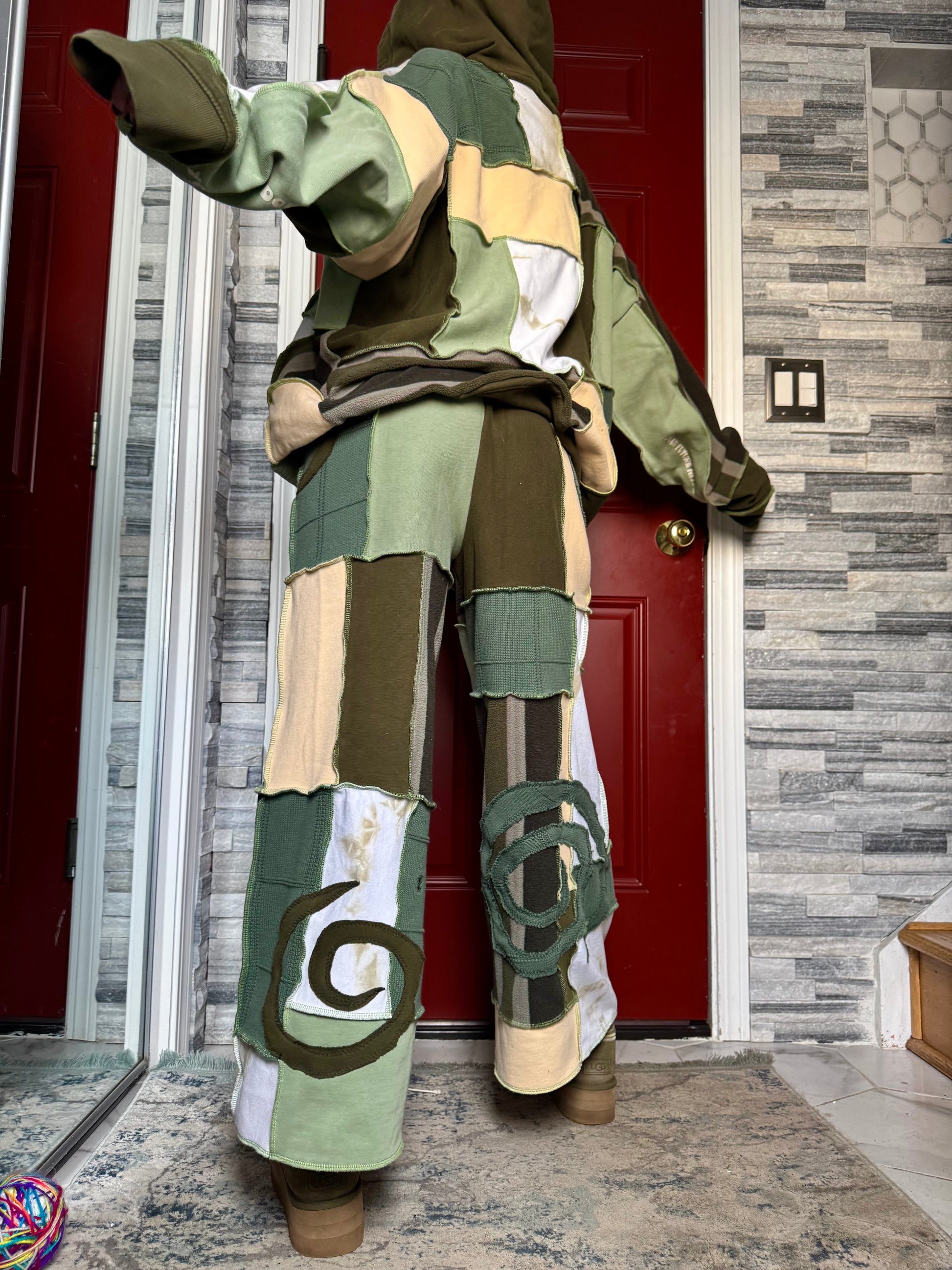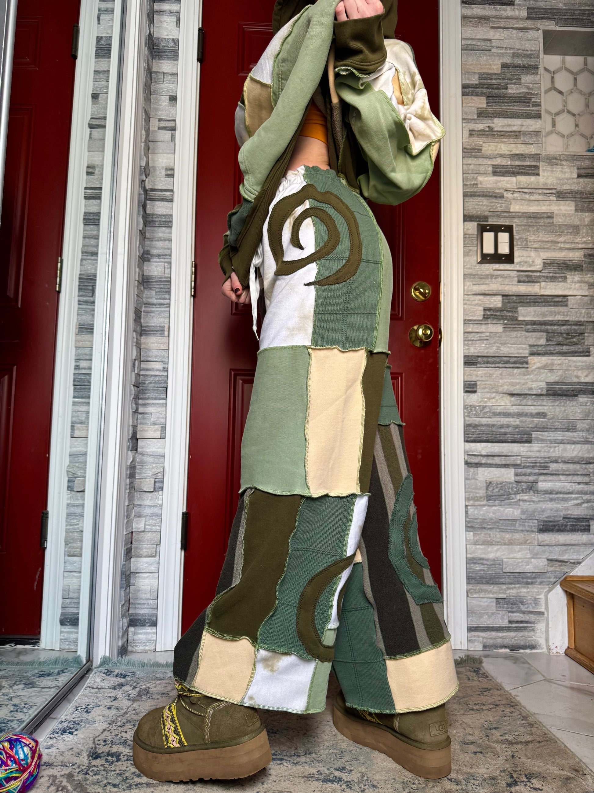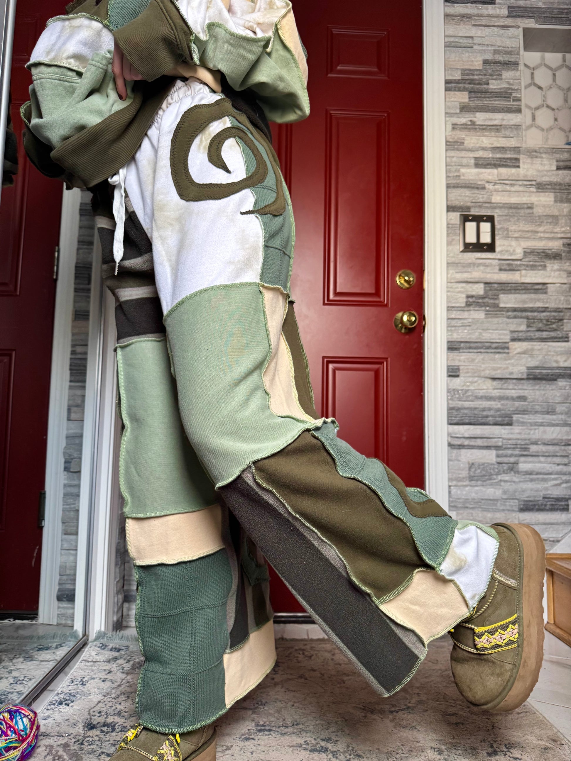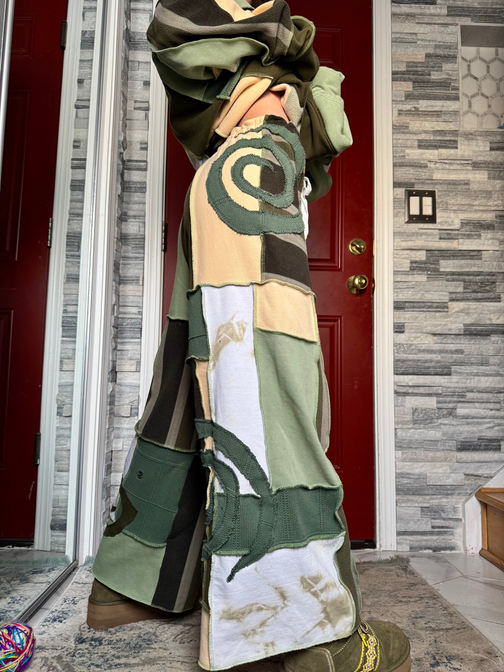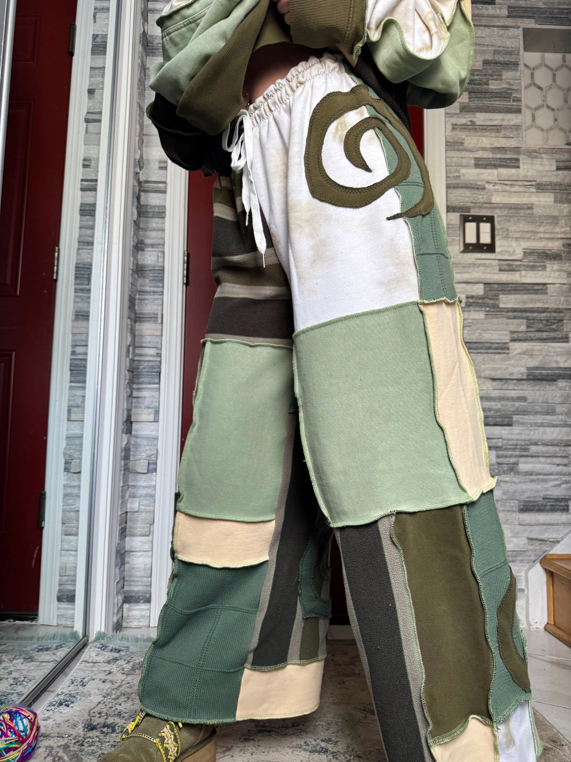 - Shades of green, cream, tan, tie dye upcycled drawstring sweatpants
