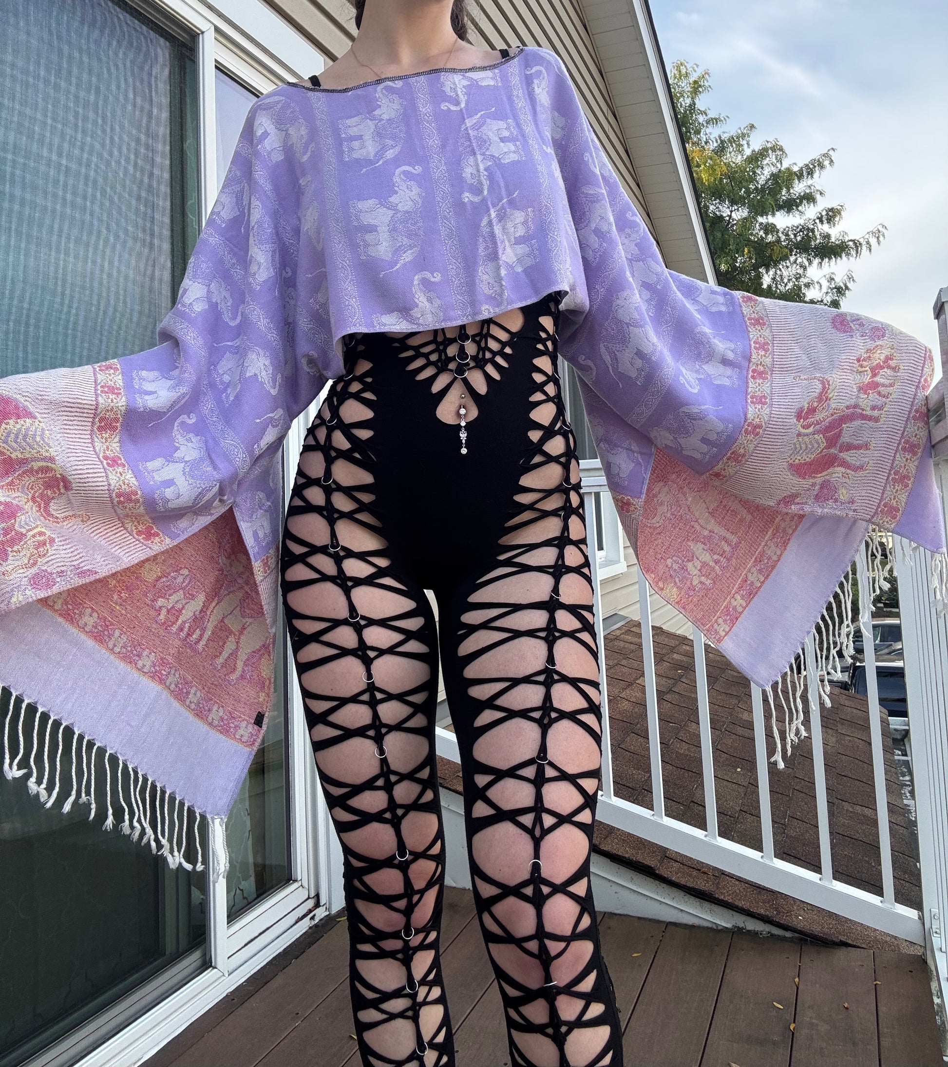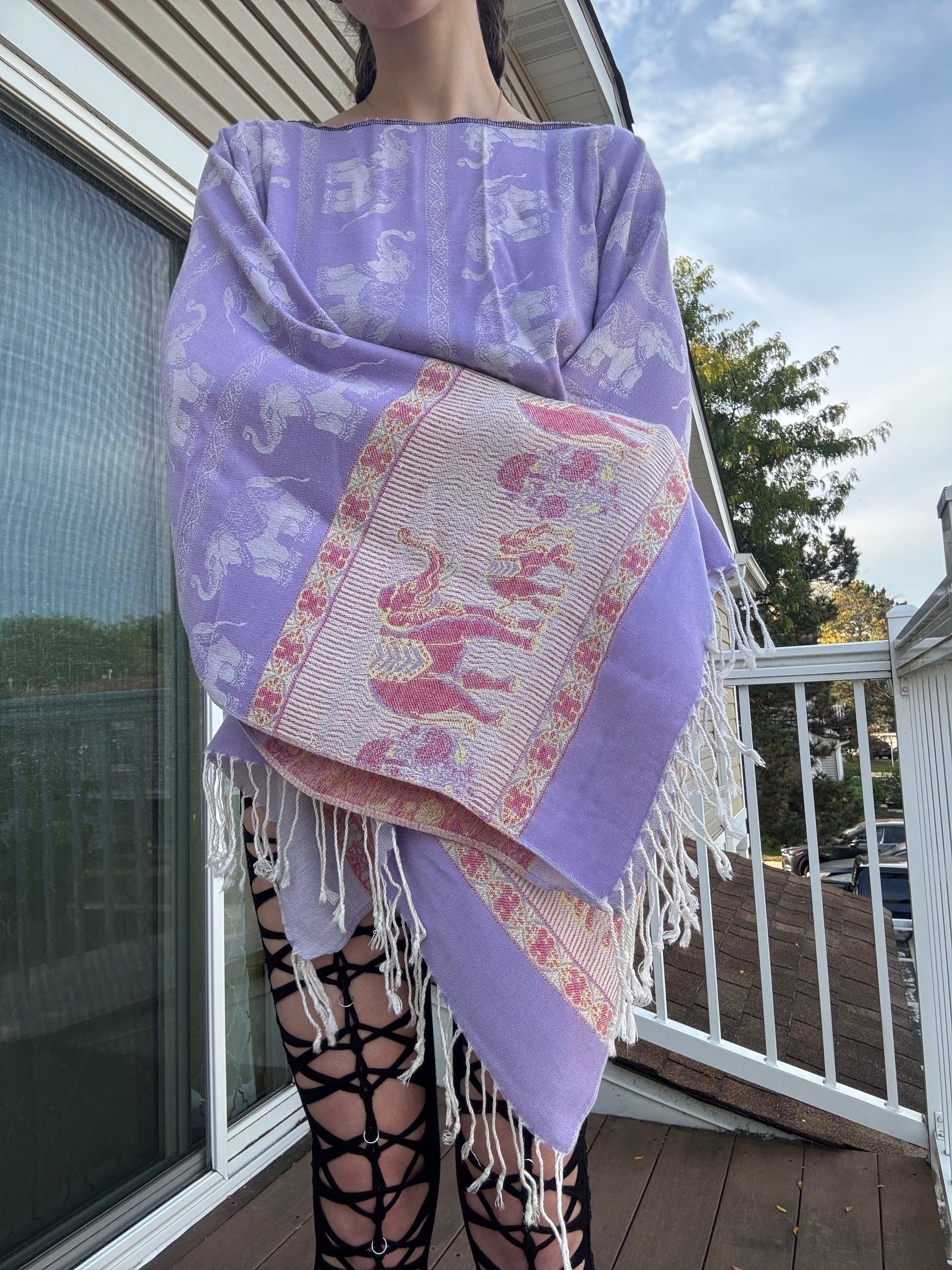 - One of one light purple elephant pattern hand sewn upcycled pashmina crewneck / long sleeve top