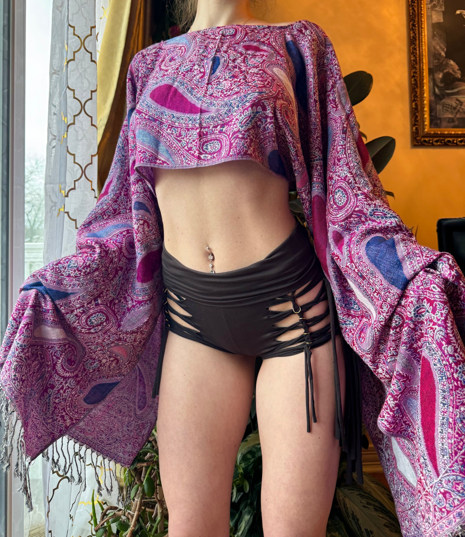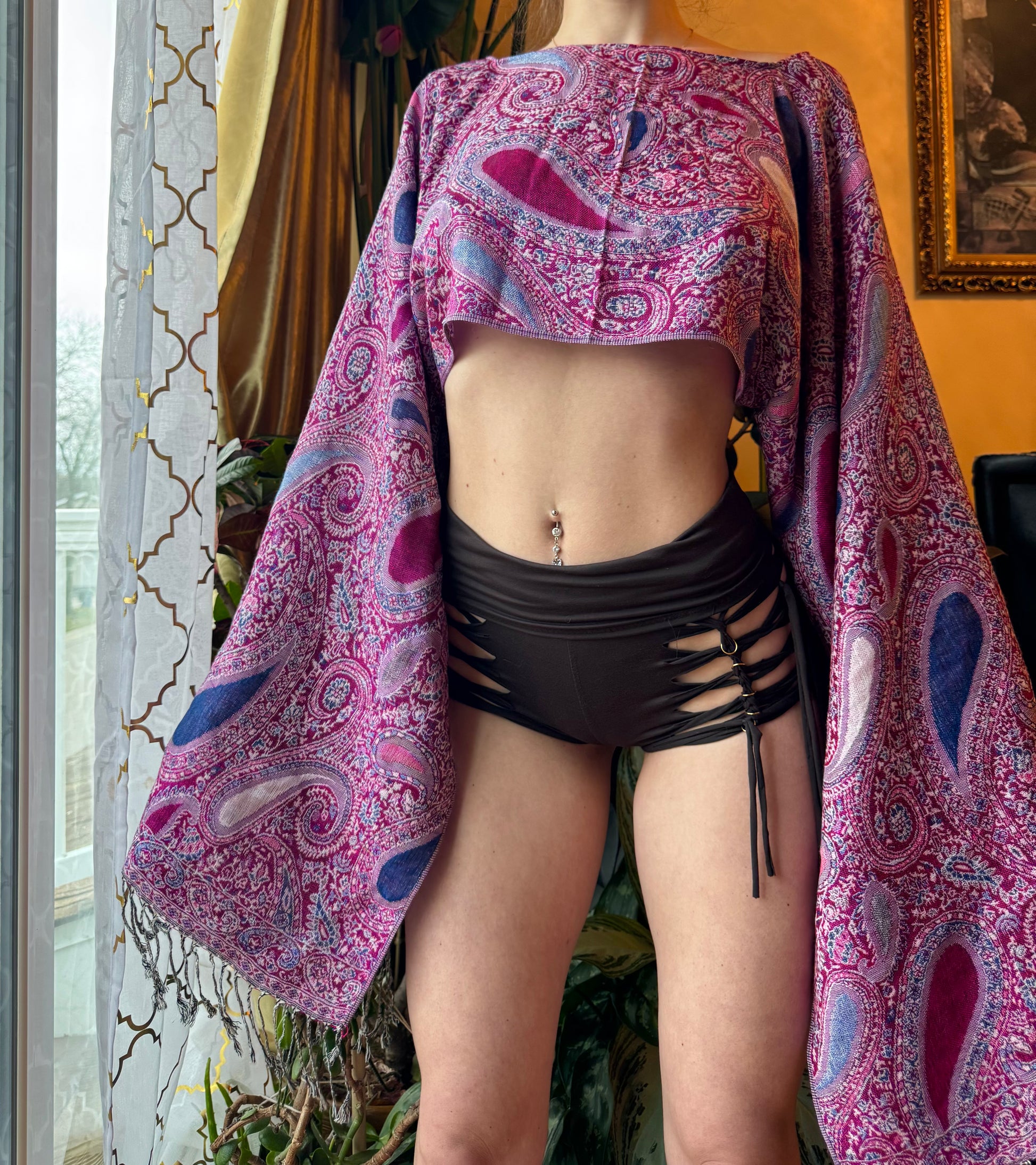 - Purple paisley patterned hand sewn pashmina crewneck / long sleeve top shawl