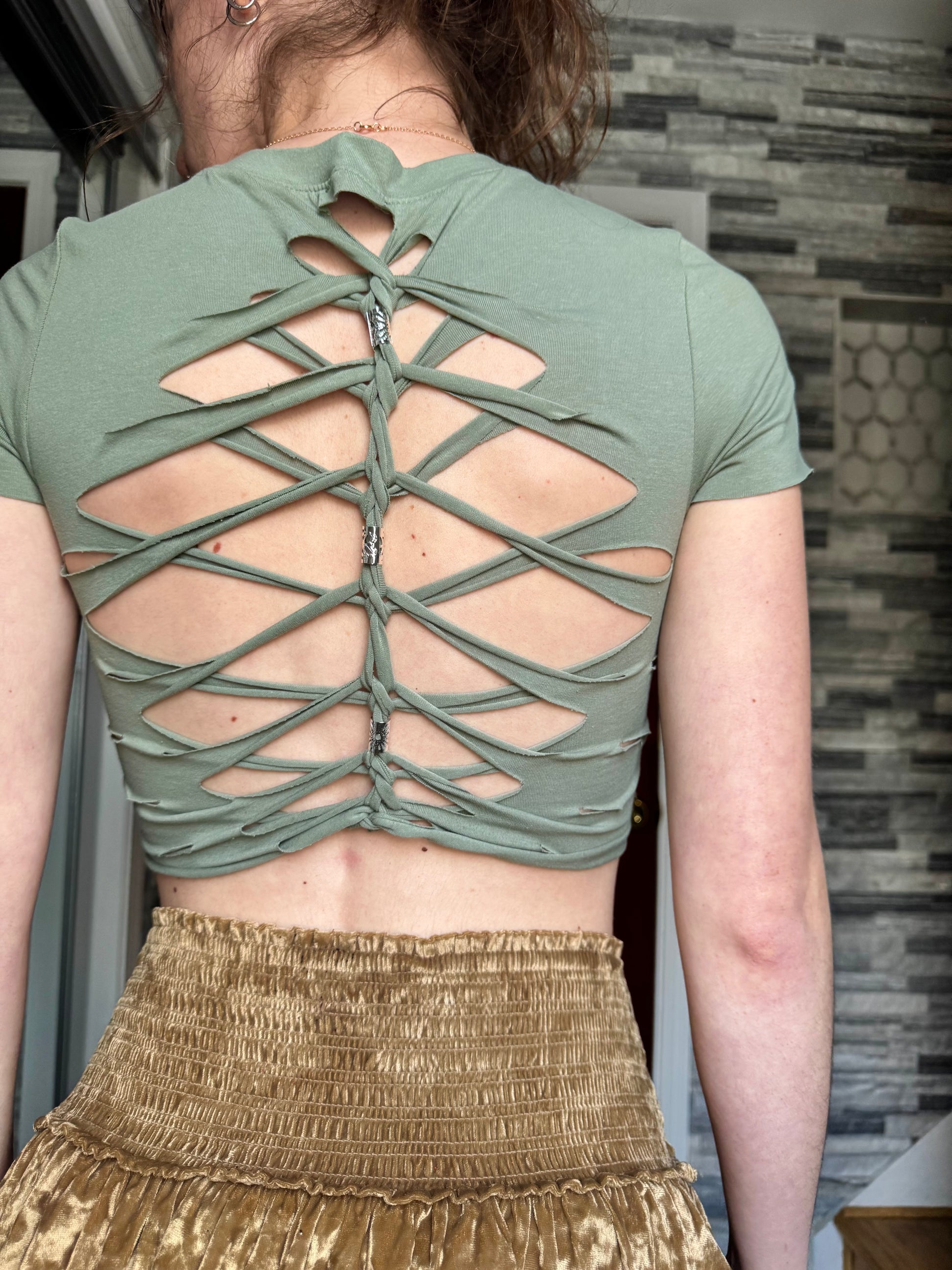 - Sage green braided/slitweave crop tee top accessorized with silver rings