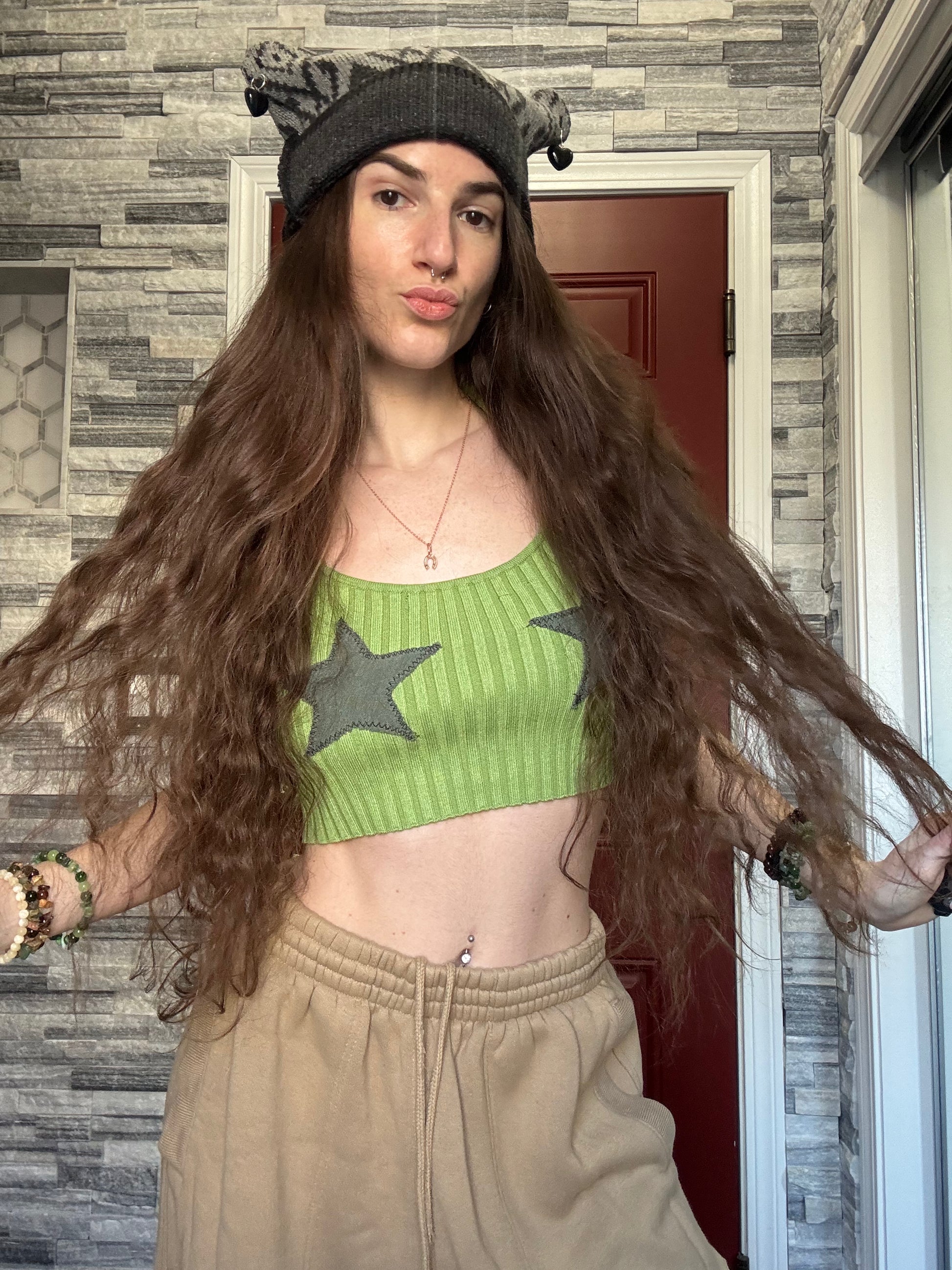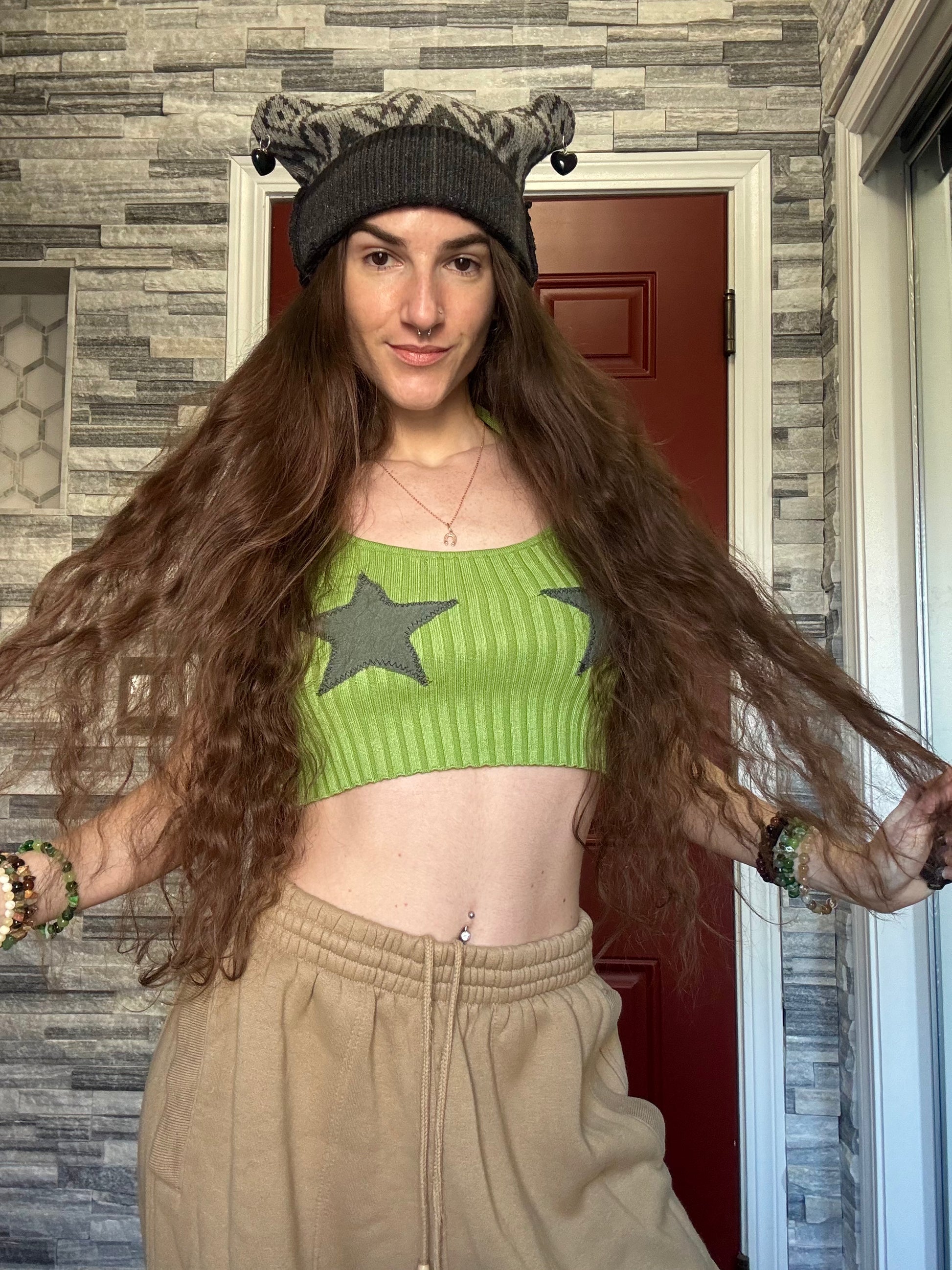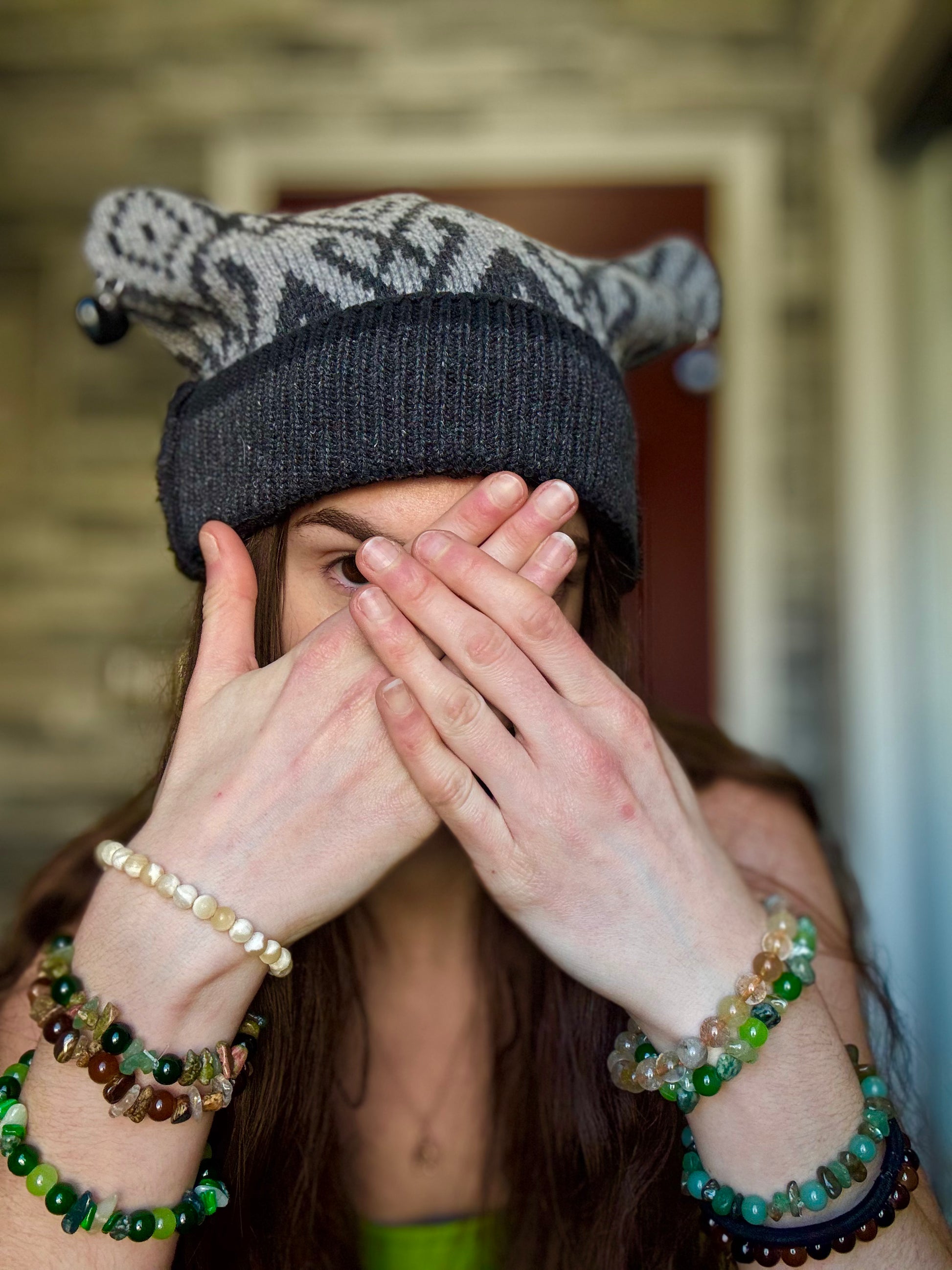 - Grey sweater beanie cat hat with dangly heart charms