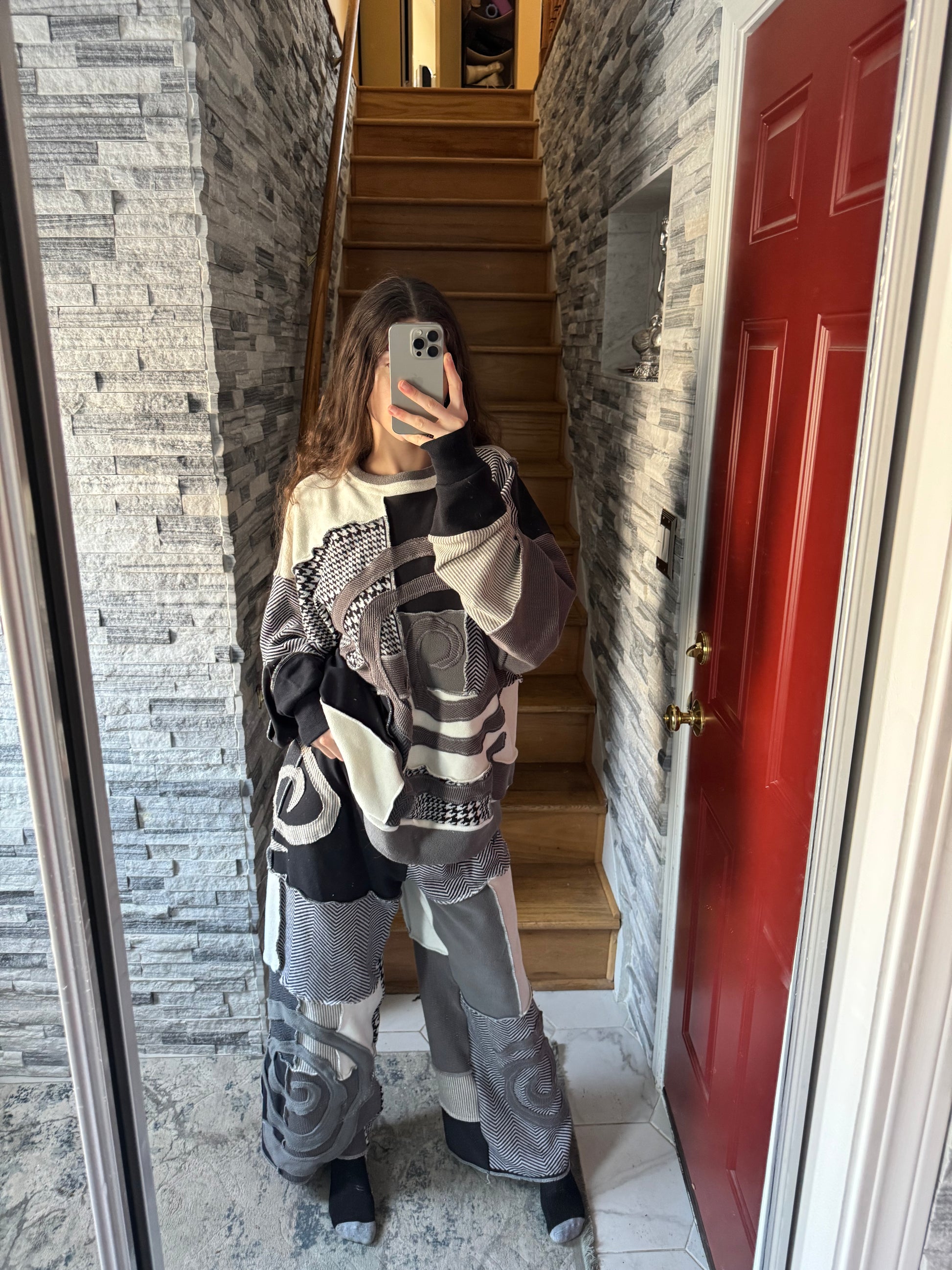 - Black, white, grey, patterned fabrics upcycled drawstring sweatpants